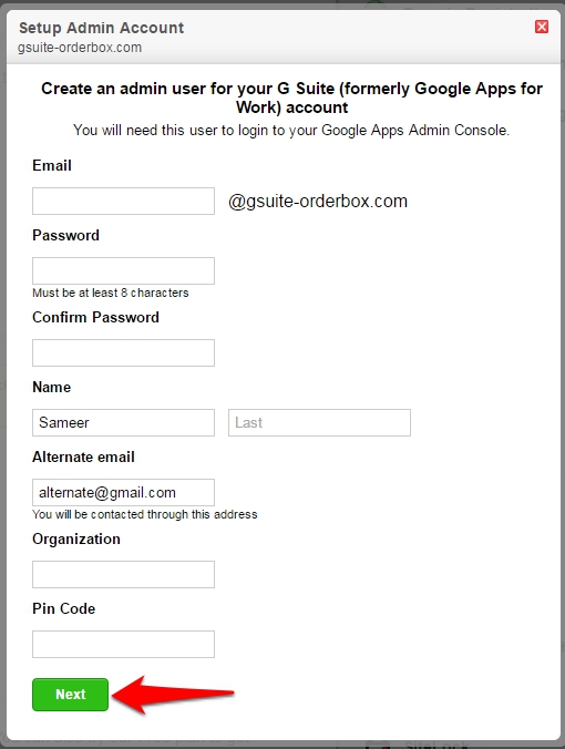 - Fill in the required fields and click on Next to setup your admin account.