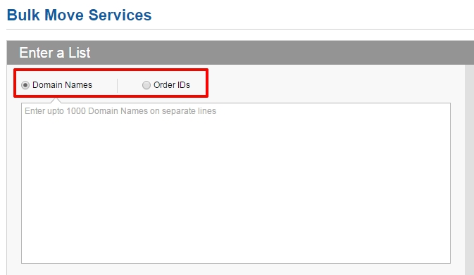 3. Enter a list of Domain Names or Order IDs you want to move. You can mention upto 1000 Domain Names or Order IDs on separate lines.