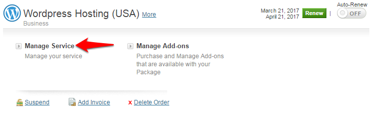 Click on the Manage Service link to get automatically logged into your Wordpress Hosting control panel.