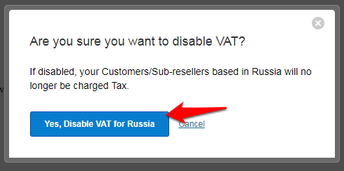 • Click on the Yes, Disable VAT for Russia button to confirm.