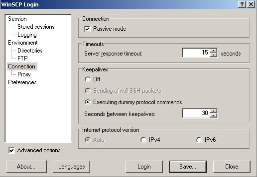 By default, the data connection mode is set to Active mode. Click Connection and select the Passive mode check box.