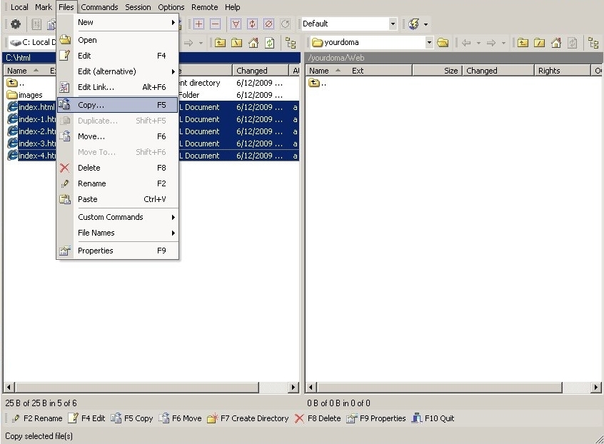 Select the desired files in the left window and from the Files menu, click Copy.
